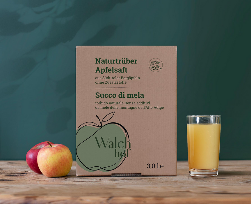 PRODUKTBESCHREIBUNG: Naturtrüber, naturbelassener Apfelsaft aus südtiroler Bergäpfel vom Walchhof aus Barbian, abgefüllt im praktischen 3 oder 5 Liter-Karton.